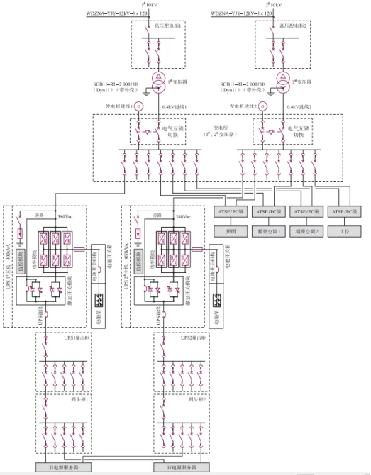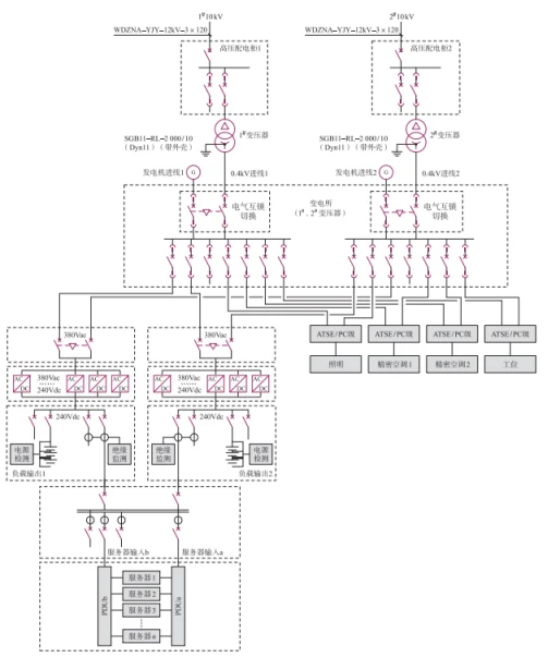 10kV高压电源分别由2路不同变电站市电引来●,高压和低压不联络,第三电源由动力中心柴油发电机引来,主备用电源和发电机电源在变压器出线处切换,保证数据中心用电设备可靠用电□=。考虑单台发电机容量远远小于2500kW,且发电机台数也未达到10台以上,故选用0.4kV低压发电机组。0◇-▽.4kV发电机组中性点应采用直接接地方式,且发电机星形点之间连接的导体应保证绝缘。数据中心共设2套400kVAUPS系统,组成2N容错型系统。双回路、双输出柜可为数据中心电子信息设备、工位插座供电◁…◆。UPS系统的蓄电池可为全部①级负荷提供15min的持续供电。数据中心的服务器单机负荷按照3kW考虑,大负荷不超过4kW。为避免数据中心UPS在电源切换过程中故障影响重要负荷的正常工作●■●,市电与柴油发电机的切换开关ATS应采用PC级且中性线重叠切换的四级开关。